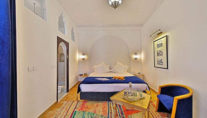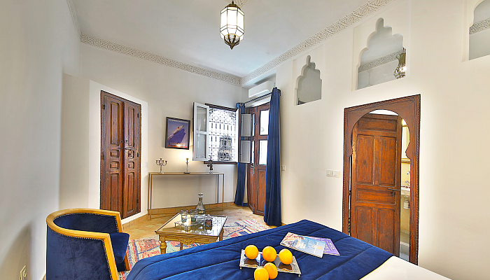 Une chambre de 17,5 m², située au rez-de-chaussée, avec un lit de 160 cm. La chambre est équipée d'une salle de douche, d'un système d'air conditionné indépendant et de wifi connecté à la fibre optique.